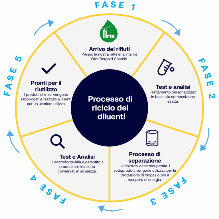Nel 2024 abbiamo gestito in sicurezza oltre 80 milioni di litri di prodotti chimici esausti per la pulizia. Il nostro servizio comprende il ritiro conforme presso le sedi dei clienti, lo stoccaggio nella nostra rete di filiali e il successivo riciclo o recupero energetico, evitando così una gestione impropria o uno smaltimento non conforme dei rifiuti. Presso il nostro impianto interno in Germania, ricicliamo circa il 70% dei diluenti usati dai nostri clienti. I prodotti chimici rigenerati vengono riutilizzati come parte del nostro impegno verso un modello a ciclo chiuso.